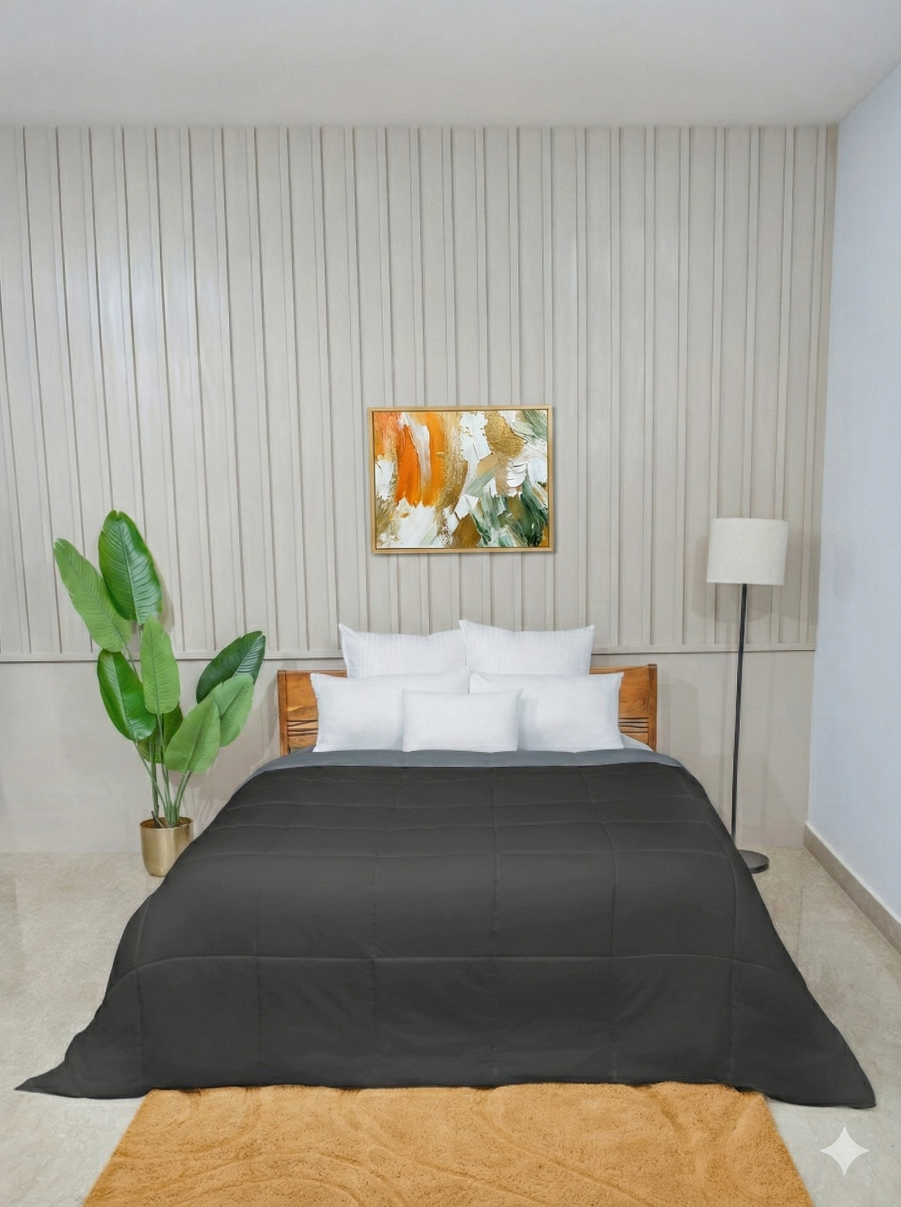 A Premium Reversible Comforter: Enjoy luxurious comfort with this lightweight, reversible microfiber comforter, featuring a soft filling that adjusts to your body temperature for cozy, year-round use.